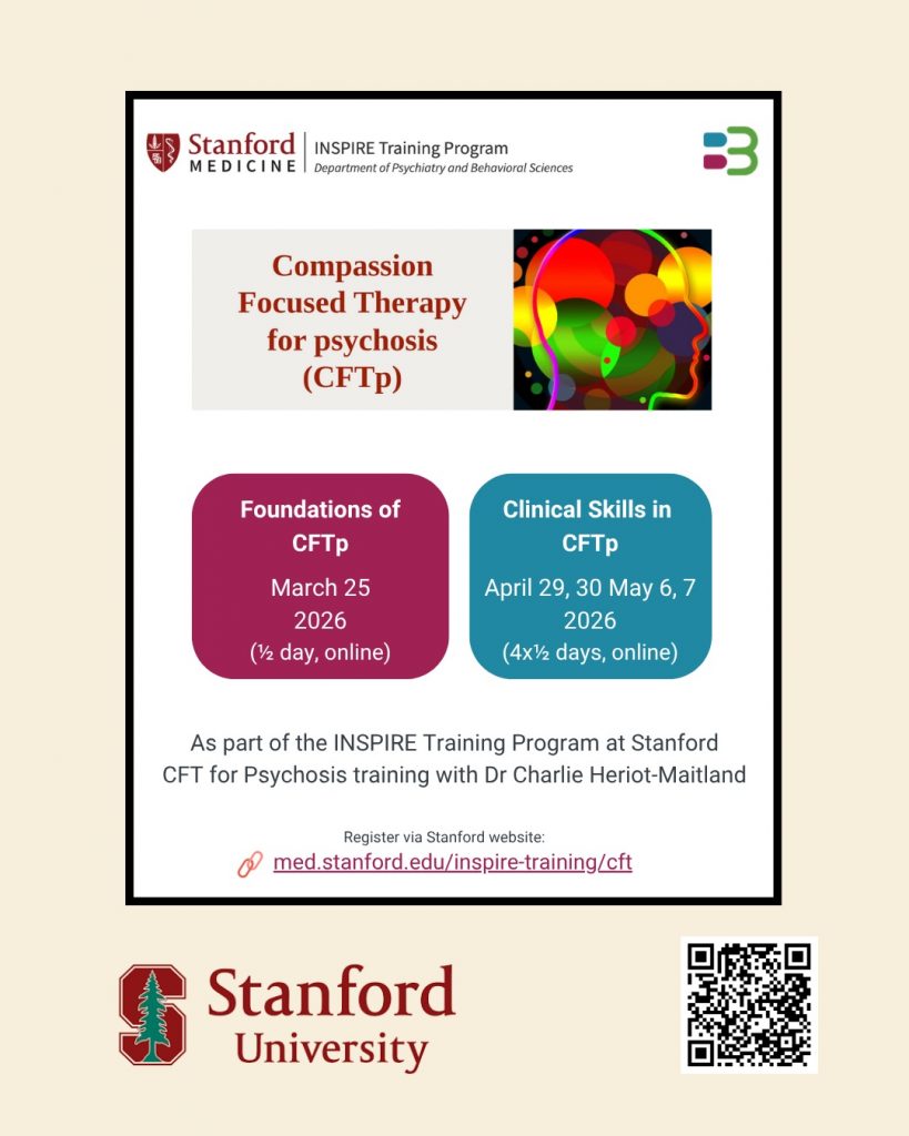 Upcoming CFT for Psychosis training dates: 🇬🇧 4-5th December 2025 - 09.30-16.30 (GMT) - 2-day workshop (online) - Compassionate Mind Foundation 🇺🇸 25th March 2026 - 09.00-13.00 (PST) - ½-day workshop (online) - Stanford INSPIRE Training 🇺🇸 29th April - 7th May 2026 - 09.00-13.00 (PST) - 4 x ½-day workshops (online) - Stanford INSPIRE Training @compassionatemind_foundation @stanford.inspire.training